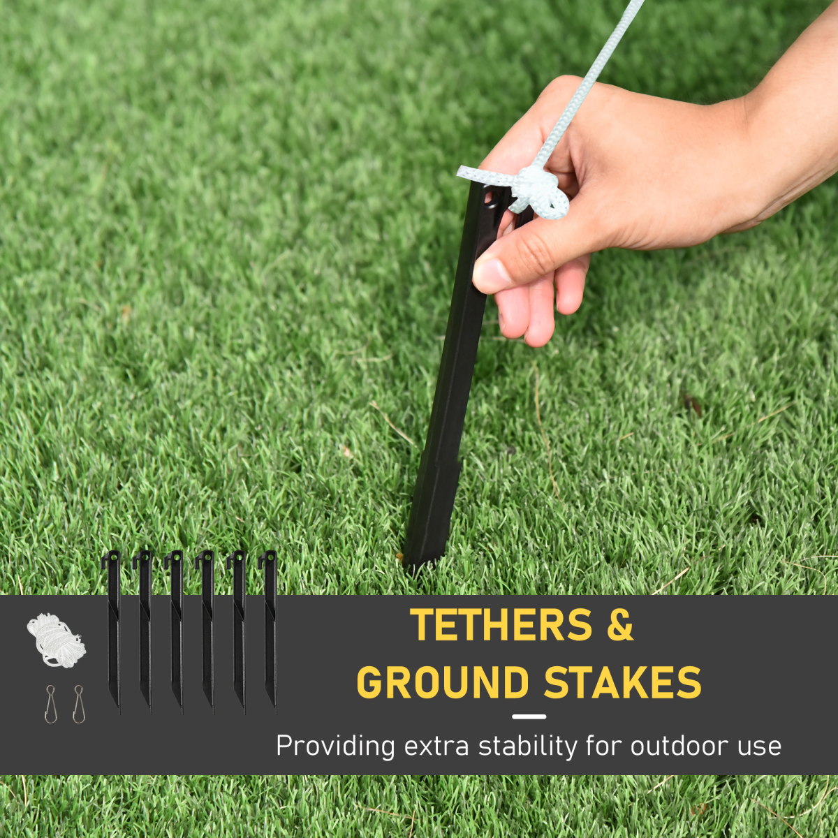 Included accessories: 6 ground stakes, 2 guy ropes, and 2 sandbags help secure your display in windy conditions.